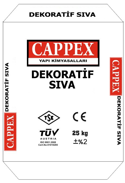 Yüzey Hazırlığı: Sıcak havalarda uygulama öncesi dekoratif sıva astarı olarak CAPPEX tatbik edilmesi tavsiye edilir. CAPPEX temiz ve soğuk su içerisine yavaş yavaş ilave edilerek karışım topaksız hale gelene kadar düşük hızlı bir karıştırıcı ile yaklaşık 10 dakika karıştırılır. Karıştırılan harç 5 dakika dinlendirilir ve tekrar karıştırılır. Eğer gerekli ise karışımın kıvamı su katılarak tekrar ayarlanır. Gerekli su miktarı hava şartlarına göre ayarlanmalıdır. Makineyle karıştırılırken ürün içindeki taneciklerin aşınmamasına dikkat edilmelidir. Her parti harç karışımı için eşit su miktarı kullanılmalıdır. Aksi taktirde yüzeyde desen ve ton farklılıkları oluşabilir. Hazırlanan karışım hava şartlarına da bağlı olarak 2 saat içerisinde tüketilmelidir. Hazırlanan homojen karışım çelik mala ile düzgün bir şekilde yüzeye sürülür ve üründeki tanecik kalınlığında bir tabaka elde etmek için fazla malzeme yüzeyden temizlenir. CAPPEX uygulama yüzeyine homojen bir şekilde uygulandıktan en çok 10 dakika içerisinde desen verilmelidir. ince tane dokuyu elde etmek için plastik veya poliüretan mala yardımıyla dairesel hareketlerle desen verilir. Desen verilirken mala yüzeyi sık sık sıyrılmalıdır. Aynı yüzeyde aynı şarj numaralı ürünler kullanılmalıdır. Geniş alanlı yüzeylerde bindirme olmaması için uygulama esnasında yeterli sayıda insan çalıştırılmasına, malzemenin ara verilmeden ve derz bitişlerine ya da detay köşelerine gelinceye kadar kesintisiz sürülmesine özen gösterilmelidir.