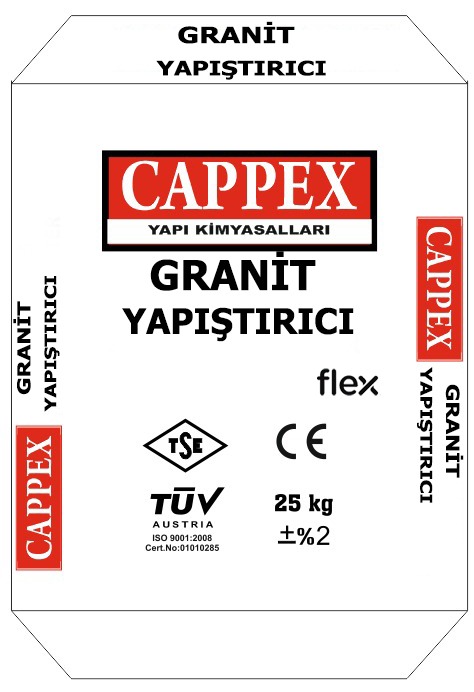 Karıştırma: Yapışmayı engelleyici her türlü maddeden arındırılmış, temiz bir kap içerisine normal çevre sıcaklığından alınan 6,0 – 7,5 lt. temiz, berrak su konulur. Su ile dolu kap içine toz halde, 25 kg torbada olan CAPPEX FLEX, boşaltılır. Seramik karıştırıcı ucu takılmış, düşük devirli bir karıştırıcı ile topaksız homojen bir karışım elde edilinceye kadar karıştırılır. Karışım süresi minimum 5 dk. olmalıdır. İşlem sonunda elde edilen harç 3 dk. dinlendirilip, tekrar 2 dk. homojen hale gelinceye